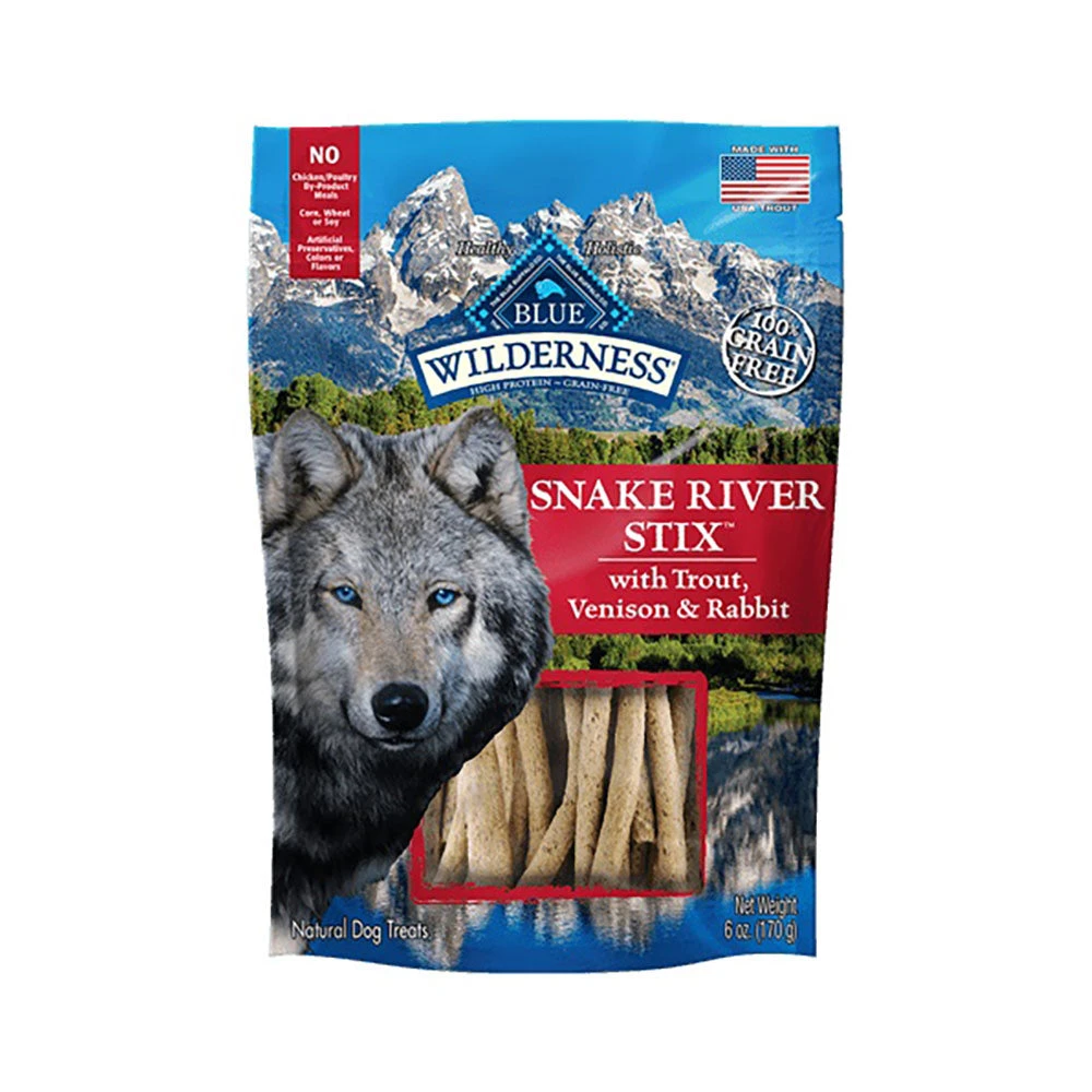 The trout are jumping and the wild game is aplenty. Now your dog can join his ancestral wolf pack and enjoy a meaty treat inspired by one of their favorite hunting regions, the bountiful Snake River. BLUE Wilderness Snake River Stix are tasty, soft-moist treats made from the finest natural ingredients. Featuring a protein-packed blend of trout, venison and rabbit, Snake River Stix are wildly delicious rewards worthy of your dog’s wolf ancestors. Like all BLUE Wilderness foods, Snake River Stix are grain-free so your dog can enjoy a high-protein treat without any of the grains that contain gluten.
