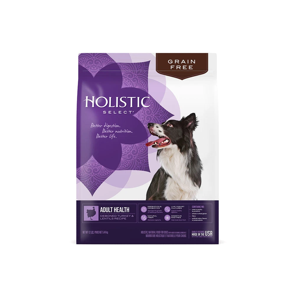 Holistic Select® grain-free dry dog food recipes are formulated with the digestive support & balanced nutrition your pet needs to live their best life. Grain-free, with optimal levels of protein plus prebiotics & probiotics, live yogurt cultures, digestive enzymes, and natural fiber these recipes enhance digestion and total body health. Holistic Select Grain Free Adult Health Deboned Turkey & Lentils Recipe is formulated to meet the nutritional levels established by the Association of American Feed Control Officials (AAFCO) Dog Food Nutrient Profiles for maintenance.