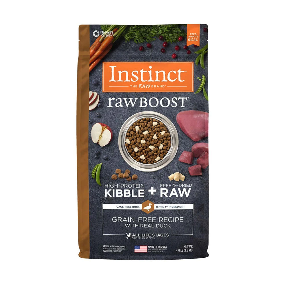 High animal-protein, grain-free, boosted nutrition with bites of freeze-dried raw meat, Instinct Raw Boost Grain-Free Recipe with Real Duck is a better way to feed kibble. Unlock your dog’s potential to thrive and put more of the pure, real nutrition of raw into every bowl.