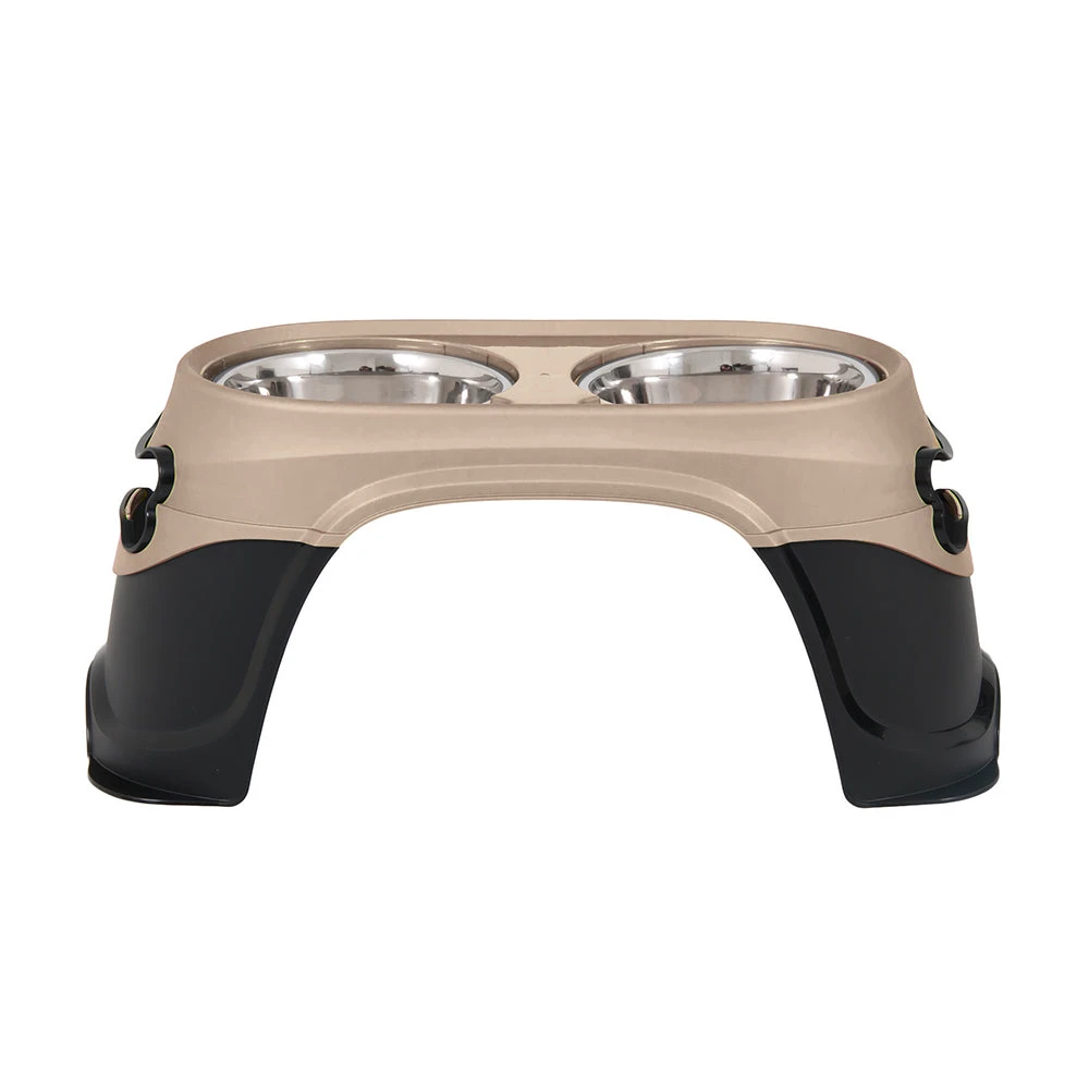 Meet dogs at their level with the Petmate® Easy Reach Diner® elevated feeder and waterer! Any dog will benefit from the improved digestion that comes from eating in a comfortable position, and older dogs will appreciate how easy it is on their joints. Prevents the stooping and discomfort associated with bending down to eat or drink. Easy-to-grip bone-shaped handles for the pet parent and removable stainless steel dishwasher safe bowls make the Easy Reach Diner easy to lift and clean. Elevated, spill-free rims help to keep water and food where they belong and rubber inserts reduce noise and keep the bowls in place. Ideal for taller dogs and large breed dogs.