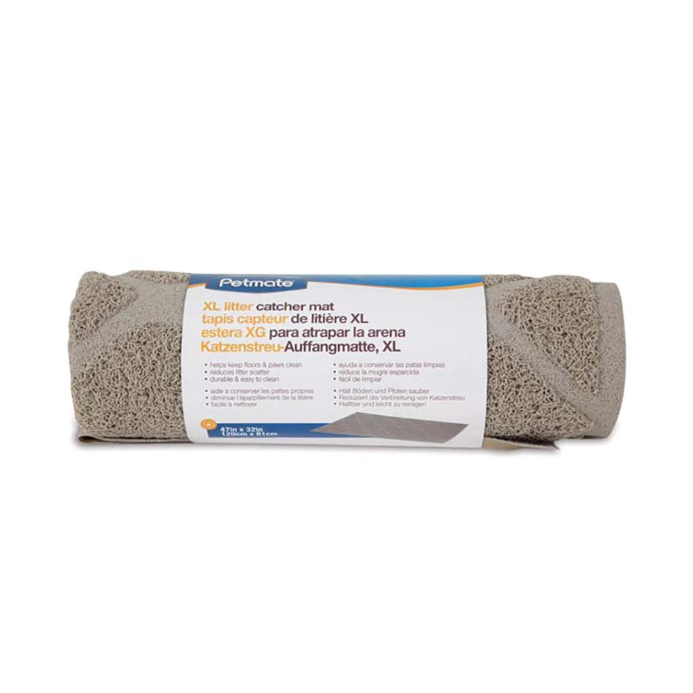 Minimize litter scatter and keep floors clean with a Petmate® tufted Litter Catcher Mat created from a soft, rubberized material that is easy on paws. The webbed design traps litter scatters as your cat exits the litter pan preventing otter from scattering throughout your home. The soft, flexible surface cleans litter from the paws of your cat as it steps out of the litter box. Constructed using quality durable materials means this mat will last for years. Easy to clean simply shake the litter from the mat or vacuum it off. The mat can also be washed with cold water and then air dried to keep the mat from harboring odor-causing bacteria. Pet parents choose from either an extra large mat in gray or large in pumice stone.