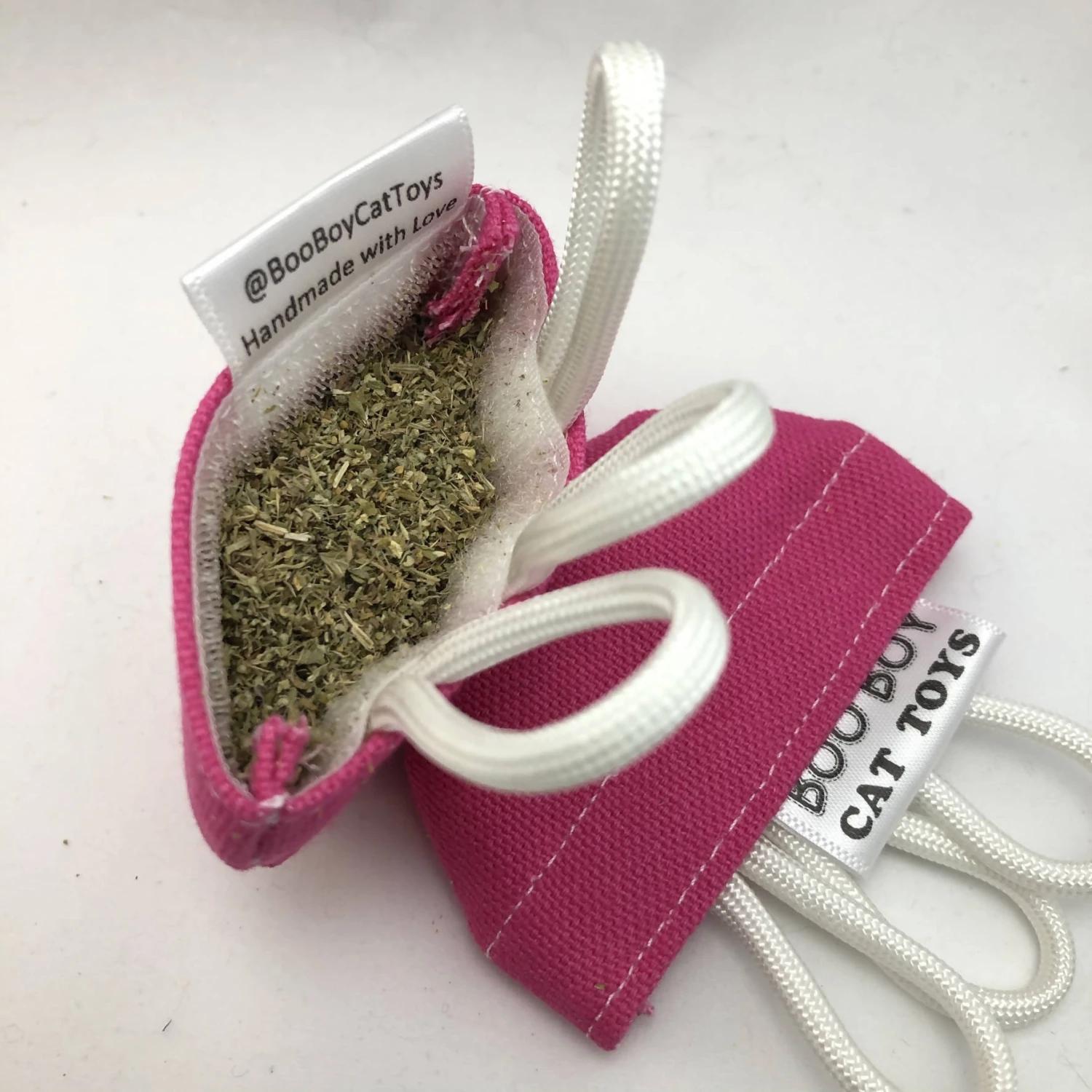 • Made from heavy-duty pink cotton canvas and white paracord so it stands up to even the roughest kitty players