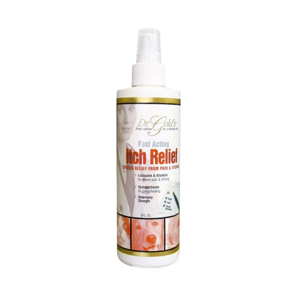 Dr. Gold’s® Itch Relief Spray is scientifically formulated with advanced OTC medicated ingredients to specifically target pain, while providing rapid relief for irritated and itchy areas. HOT SPOTS & IRRITATED SKIN: Pet parents must pay close attention to environmental, dietary and situational ailments irritating your pet’s skin such as: allergies, fleas, tick bites, matted/thick/dirty coats, sun burn, wet dogs, or anal sac disease. These ailments can cause you pet to chew, lick, bite, and scratch those areas – at times – to no avail, which can become very painful and dangerous for your pet. Sometimes chewing can even be prompted by boredom. Hot Spots and inflammation can occur quite rapidly after a pet starts itching, biting and licking these affected areas – which will prompt the development of painful, red, and moist irritated lesions. These lesions are called hot spots, also known as acute moist dermatitis, and must be treated immediately. TIPS FOR PREVENTING HOT SPOTS: •Groom your dog regularly and keep hair clipped short. •Use flea & tick products recommended by your vet. •Keep your pet active and healthy. Feed a good diet, and provide lots of exercise and play time to prevent boredom. •Dry your pet completely after a bath, and clean and dry pet after a swim in the lake or ocean. It’s important to determine the cause of the underlying issue, thus you should consult your veterinarian if hot spots become a persistent problem. In between vet visits, Dr. Gold’s® Itch Relief Spray provides Hydrocortisone, a corticosteroid to control itching and inflammation while Lidocaine, an OTC analgesic reduces pain. GOLD’S® ITCH RELIEF SPRAY: Dr. Gold’s® Itch Relief Spray is scientifically formulated with advanced OTC medicated ingredients to specifically target pain, while providing rapid relief for irritated and itchy areas. Hydrocortisone and Allantoin soothe inflammation and skin irritations while Lidocaine relieves pain from itching, biting and chewing. Effectively treats minor skin irritations, hot spots and rashes caused by flea bites, poison ivy, harsh shampoos, allergies, boredom and many other causes. Anti-Inflammatory Hydrocortisone and Allantoin help accelerate pets’ natural healing process while preventing the release of substances in the body that cause inflammation. Also try Dr. Gold’s® Ear Therapy, made with Ketoconazole, Lactic Acid, Benzoic Acid and Salicylic Acid to treat yeast, fungal & bacterial infections. Alcohol-free formula gently and effectively eliminates foul odors, reduces inflammation and cleanses the ear canal. PRECAUTIONS: Keep out of reach of children. Avoid contact with eyes. STORAGE: Store in the original container in a dry, cool place, and away from sunlight, at a temperature below 86°F or 30°C.