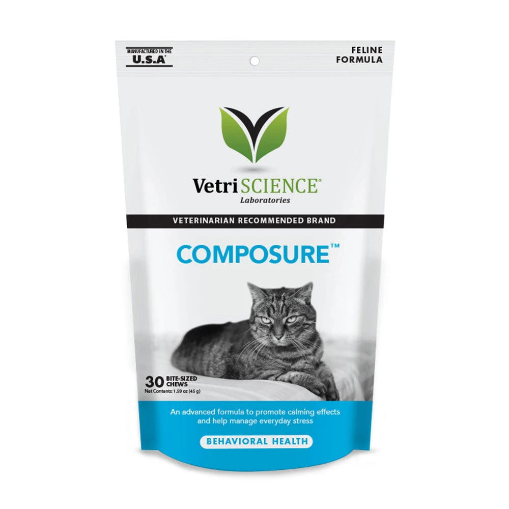 Composure™ chews for cats are a calming supplement designed to promote relaxation during stressful situations. Examples: Your cat is headed to the vet. You had a new baby. You are having guests over for the holidays. You heard there’s about to be a thunderstorm. Whenever your cat is stressed, calming chews offer positive support. Three main ingredients work together to support relaxation without affecting your cat’s energy levels or personality. The Colostrum Calming Complex™ BiopeptideBlend supports stress reduction and cognitive function; L-Theanine helps the body produce other amino acids to bring specific neurotransmitters back into balance; and B vitamins (thiamine) affect the central nervous system to help calm anxious animals. No herbals used. For use in cats only. Safe use in pregnant animals or animals intended for breeding has not been proven. If animal’s condition worsens or does not improve, stop product administration and consult your veterinarian. Store in a cool, dry place. For animal use only. Keep out of the reach of children and animals. In case of accidental overdose, contact a health professional immediately. About the Formula: Colostrum Calming Complex® BiopeptideBlend is isolated from colostrum proteins, which have a calming effect on animals. These bioactive proteins have been found to support cognitive function and stress reduction. The Colostrum CalmingComplex® Biopeptide Blend works synergistically with the L-Theanine in this formula to promote relaxation and cognition in dogs. L-Theanine supports calming and relaxation and the reduction of irritability and low mood states. L-Theanine has been extensively researched for its ability to reduce stress, anxiety, and unwanted behavior. L-Theanine is a naturally occurring amino acid found in green tea that is a derivative of the neurotransmitter glutamic acid. It helps the body produce other calming amino acids, such as dopamine, GABA and tryptophan and it helps bring certain neurotransmitters into balance. Studies on L-Theanine showed reduced anxiety-related behavior in dogs without adverse effect or drowsiness; dogs were alert, playful, and calmer in stressful situations. Thiamine (vitamin B1) helps manage stress and reduces irritability. Thiamine has been shown to affect the central nervous system to help calm and soothe anxious animals. A lack of thiamine can cause mental confusion, muscular weakness, muscle spasms, nervousness, reduced appetite, or weight loss during periods of stress. Recommended for: • Changes to environment • Boarding or kenneling • Veterinary or grooming visits • Holidays and parties • Boredom or separation anxiety • Moving or traveling • Fireworks and thunderstorms.